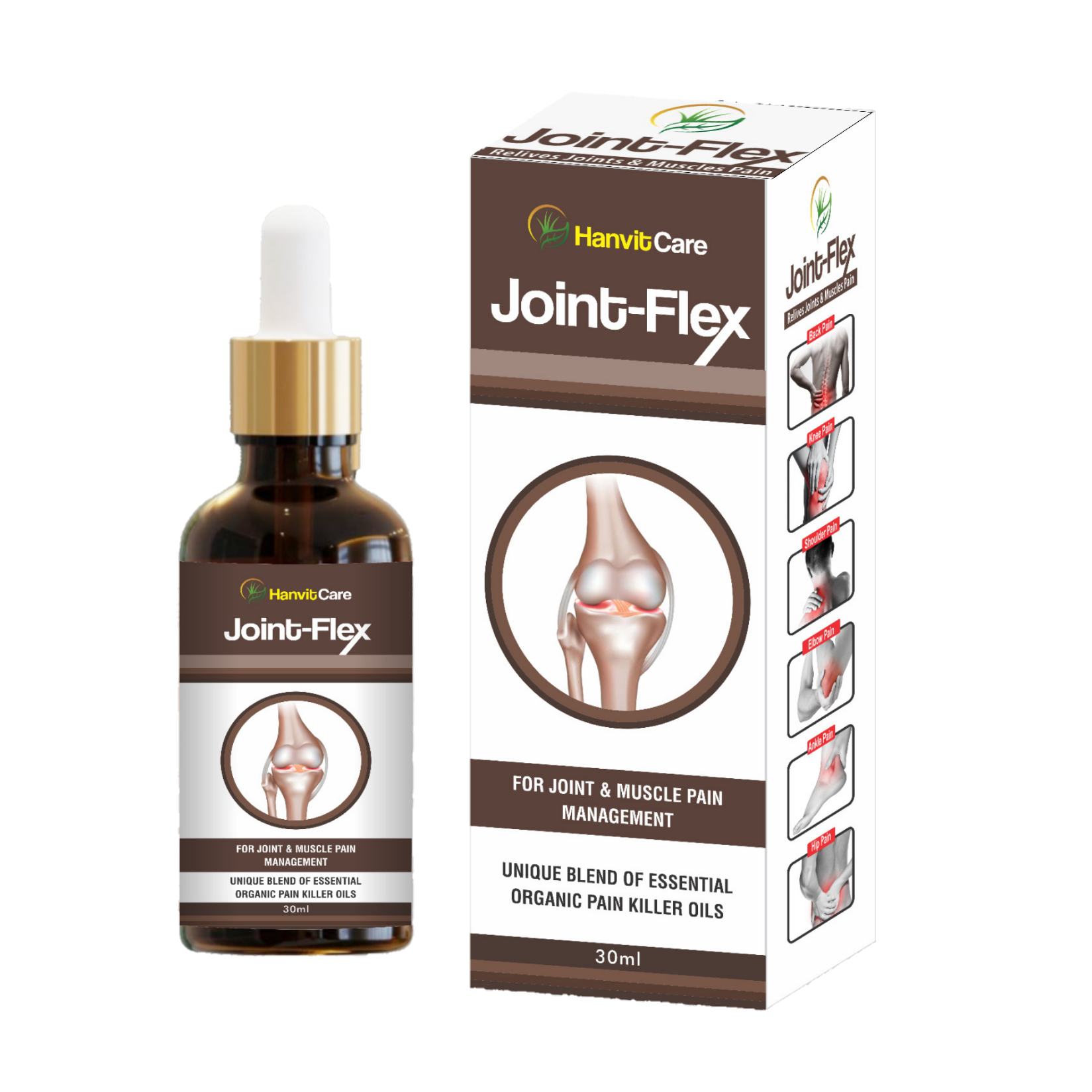 Joint-Flex essential Organic oils blend helps in reducing joints and knee pain, stiffness and swelling. The natural oils work on symptoms of pain in joints, back pain, arthritis pain, knee pain, tennis elbow, strains and sprains during sports or physical activity.